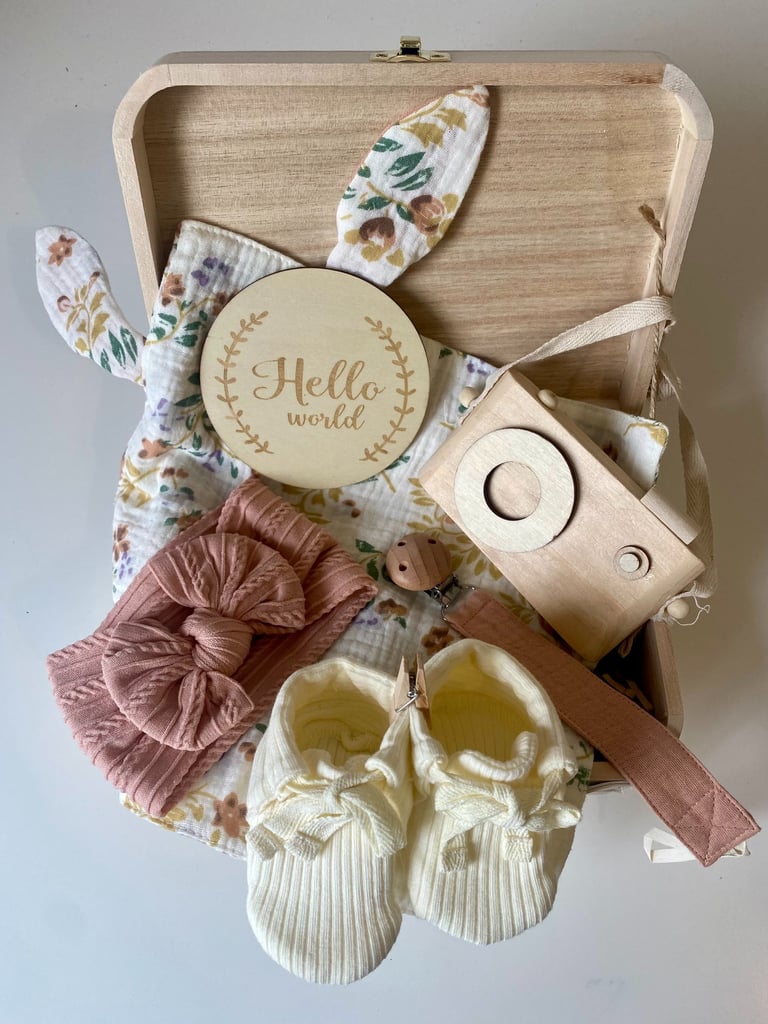 Les coffrets pour bébés se déclinent en plusieurs formats : je propose des petites valises en bois ou en rotin, de jolies boîtes décoratives, et même des penderies.
